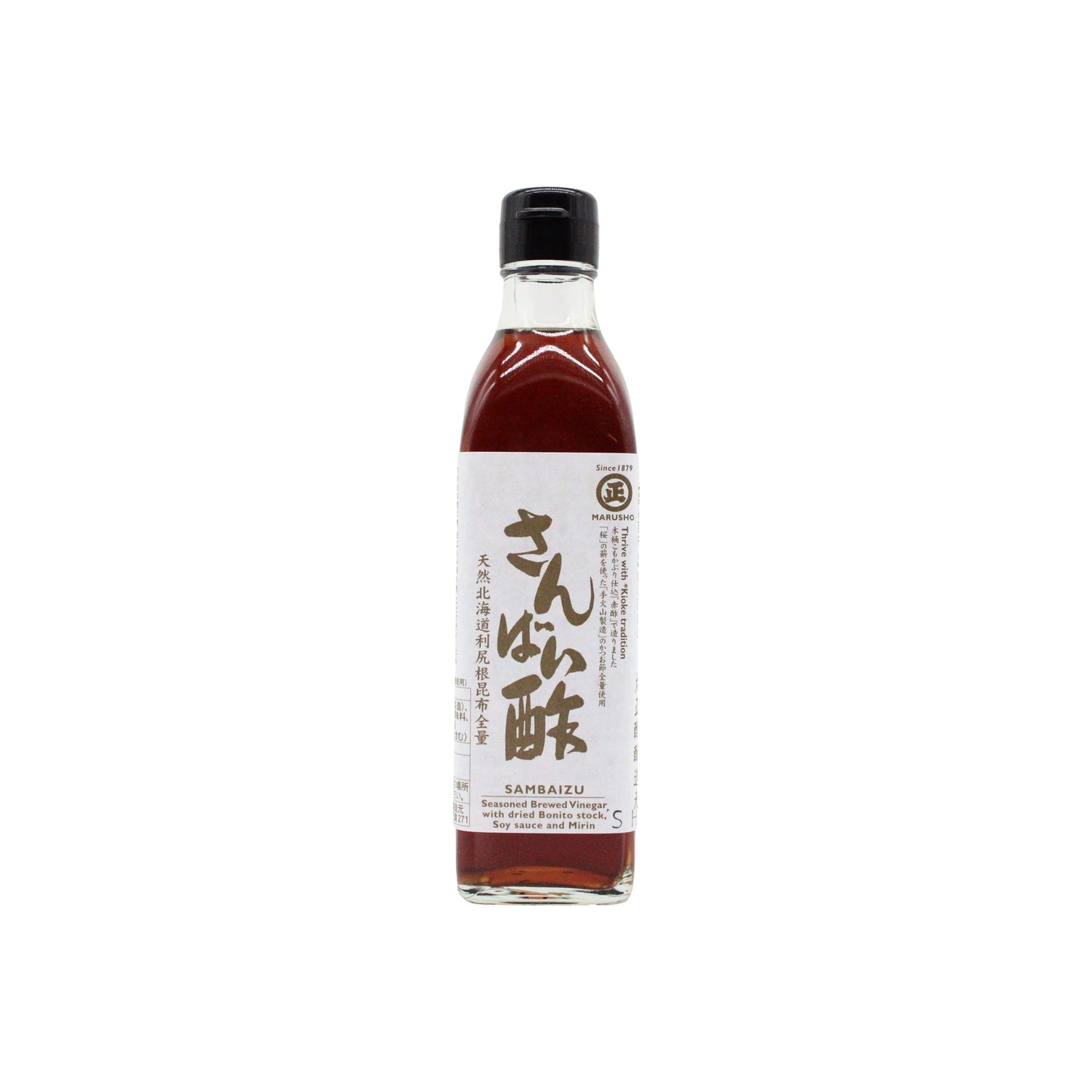 Fuji Sushisu Rice Vinegar for Sushi (360ml) comes in a clear bottle with a white label displaying Japanese text and Mount Fuji, filled with light amber vinegar ideal for adding umami flavor to your dishes.