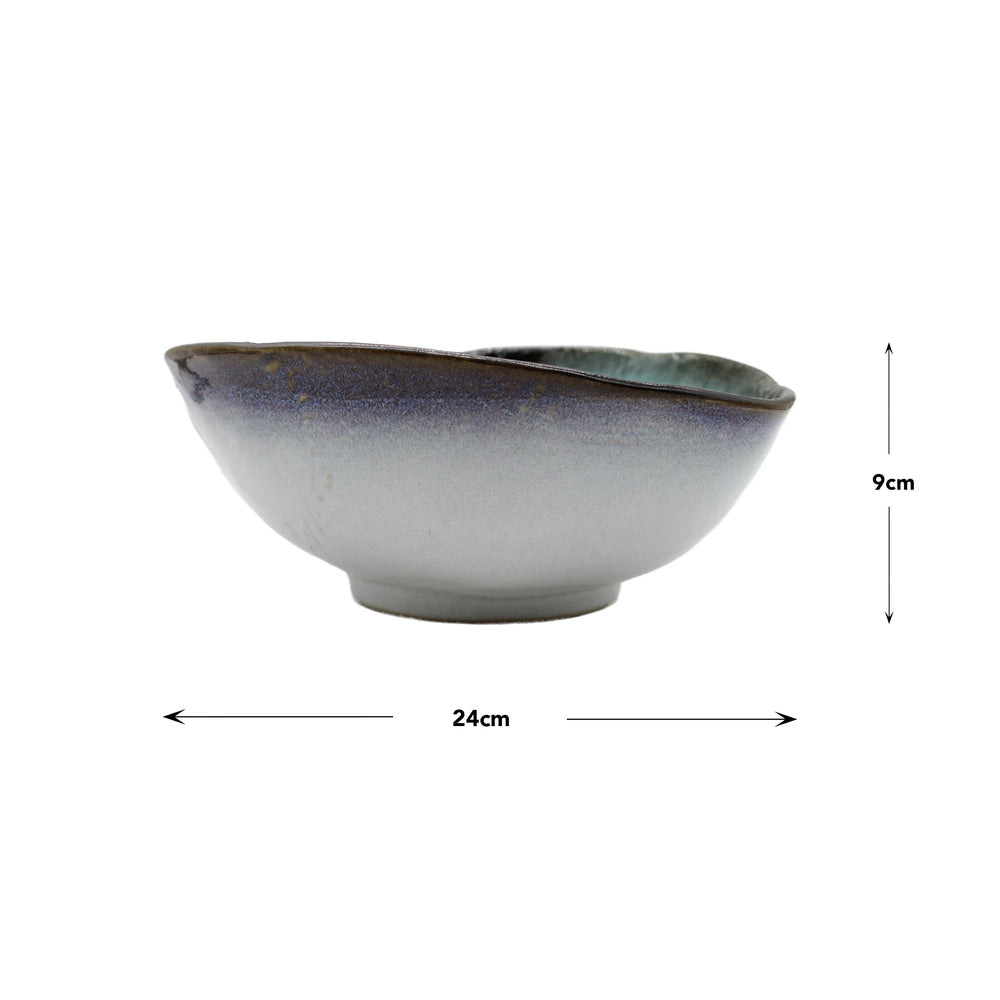 This show stopping serving bowl is part of the sky blue range, featuring a dark grey rim with ridged detail which transitions into a vibrant sky blue centre, the organic shape is inspired by the mountains of Gifu prefecture.